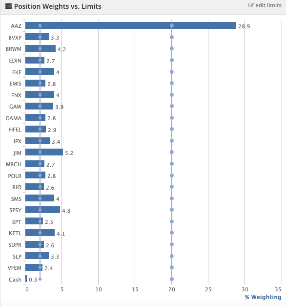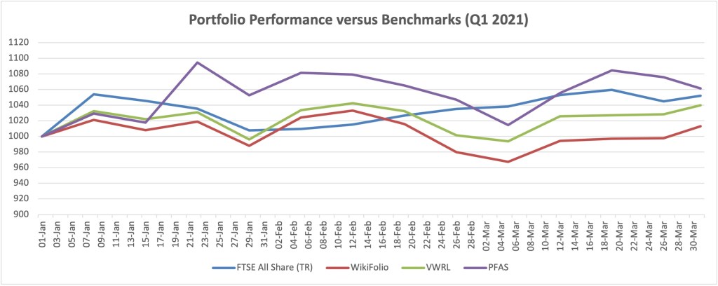 PFAS was up 6.12% for the quarter which compared favourably to the three benchmarks I use; FTSE All Share TR +5.19%, Vanguard World (VWRL) +3.99% and my Wikifolio ETF portfolio +1.31%. This said, it was up 10% in January before falling back through February to 1% and recovering during March, as per the chart below: