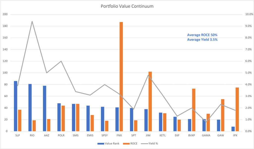 I have refreshed the portfolio value continuum with a ROCE and Dividend Yield overlay.