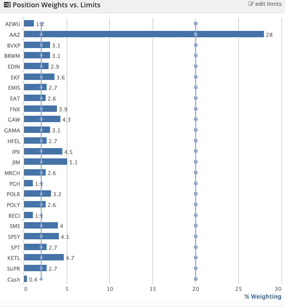 This has been an interesting exercise that has helped me think about what might cause me to sell each of my holdings. The two main themes that emerge are 1) business performance/growth prospects and 2) a key person risk (e.g. Founder/CEO). It has also helped me identify a couple of holdings where I have quite low conviction which has given me some pause for thought.