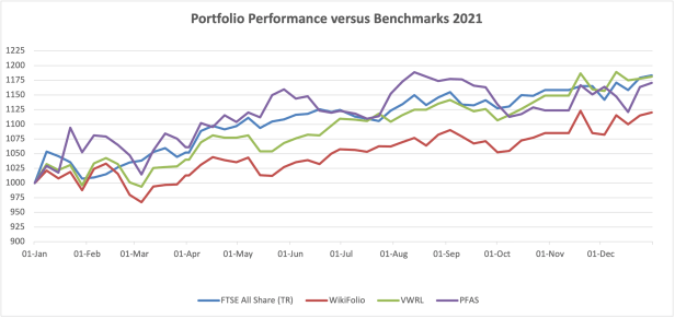 A blow-by-blow account of how my year unfolded can be viewed via my Twitter thread of weekly updates While not a vintage year, the total return for PFAS in 2021 was 17% which I regard as satisfactory. It is good to exceed my minimum absolute return target of 10%, although slightly disappointing to dip below my main benchmarks, FTSE All Share TR (+18%) and Vanguard World ETF (VWRL) (also +18%), in the final few weeks of the year. Perhaps most importantly, both capital and dividend growth were ahead of inflation which remains a key area of focus for me going into 2022. Unsurprisingly, the portfolio’s CAGR since inception (6 years) has now fallen to 28.25% and remains far ahead of my long-term expectations.