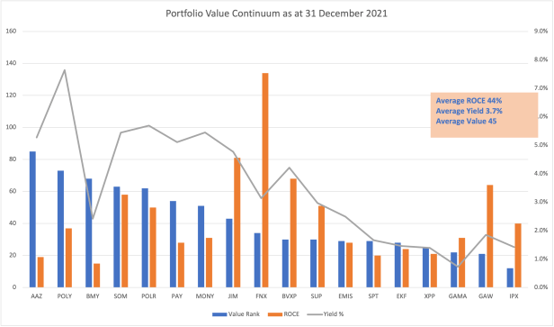 All 18 holdings in this segment fall under the banner of Quality Compounder. That is, I like to invest in high quality companies with strong cashflows that reinvest profits for further growth, returning any surplus to shareholders via a dividend. My investment strategy is depicted by the following graphic which shows each holding on a valuation continuum (using the Stockopedia Value Rank) alongside the latest Return on Capital (ROCE) figure and overlaid with the dividend yield. This segment of the portfolio is exclusively UK listed small/midcaps (i.e. Larger than £100m market capitalisation and less than £10bn).