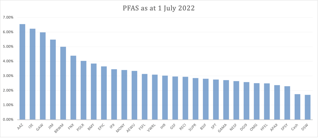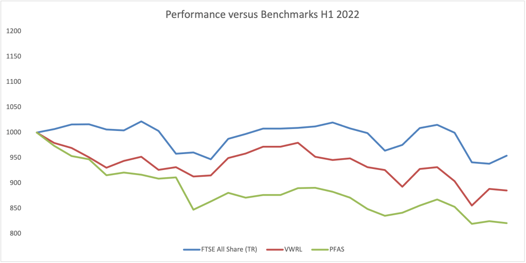 It continues to be a tough market environment. Most growth assets are now firmly in bear market territory and my portfolio (PFAS) has continued to suffer during the second quarter of 2022, falling a further 6.37% (-17.93% YTD) which was slightly better than the Vanguard World Equity ETF down 8.88% (-11.46% YTD) but slightly worse than the FTSE All Share TR Index down 5.33% (-4.59% YTD). [Note – I have had to discontinue tracking my third benchmark as Wikifolio made some inconvenient changes to their platform].
