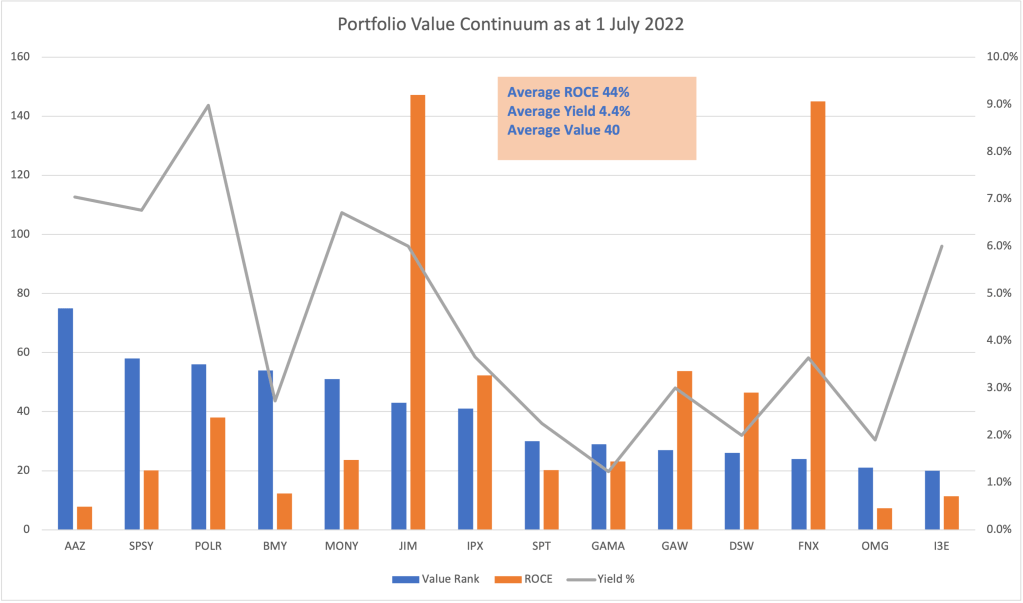 One of the charts I like to look at periodically is the Value Continuum for my direct equity holdings, overlayed with ROCE and Dividend Yield (see below). Average Value and ROCE are barely changed from when I last ran this chart six months ago while average dividend yield has risen by a full percentage point.