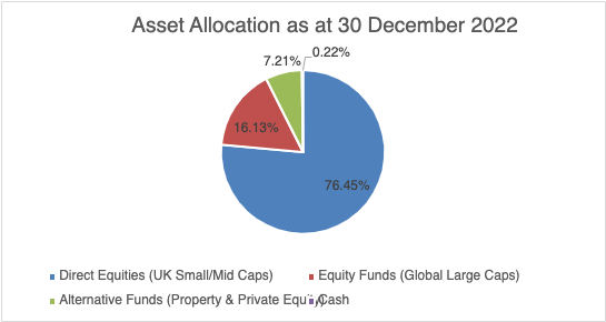 There are currently 26 holdings in the portfolio; 6 funds and 20 direct equity holdings. The direct equity holdings are all UK listed mid and small cap companies and therefore, the funds give me exposure to other asset classes, mainly large cap equities (UK and Global).