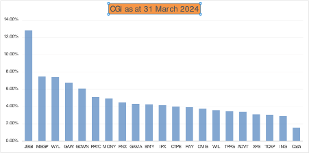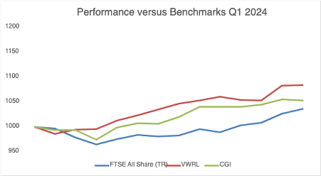Carrying on from the 2023 outcome, portfolio performance for the first quarter remains sandwiched between my two benchmarks, delivering a 5.30% return versus 3.57% for the FTSE All Share (TR) and 8.41% for the Vanguard World ETF (VWRL).