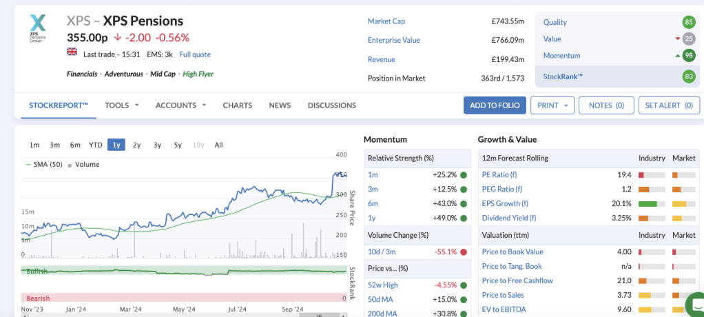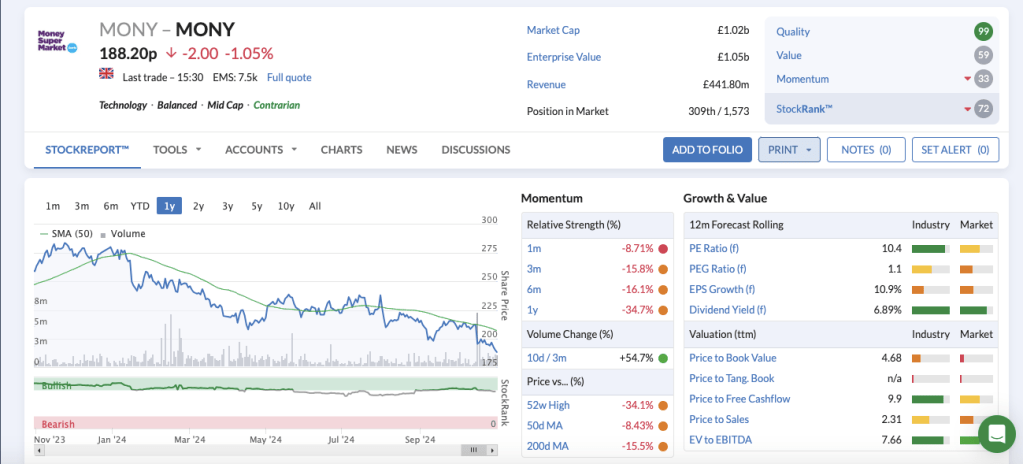 Mony Group (MONY) – Q3 Trading Update – A lack lustre report from this price comparison company (formerly known as MoneySupermarket) with overall revenue growth for the first 9 months of 2024 running at just 2%. The previous growth in insurance is slowing down and a lack of energy deals is unable to take up the slack. That said, the SuperSaveClub (their internal loyalty programme) now has over 750,000 members and can offer 11 product lines and the group remains on track to deliver in line with market expectations. The subsequent share price reaction makes MONY the current dog of my portfolio but to be honest if this is the worst share in my portfolio then I must be doing something right.