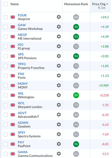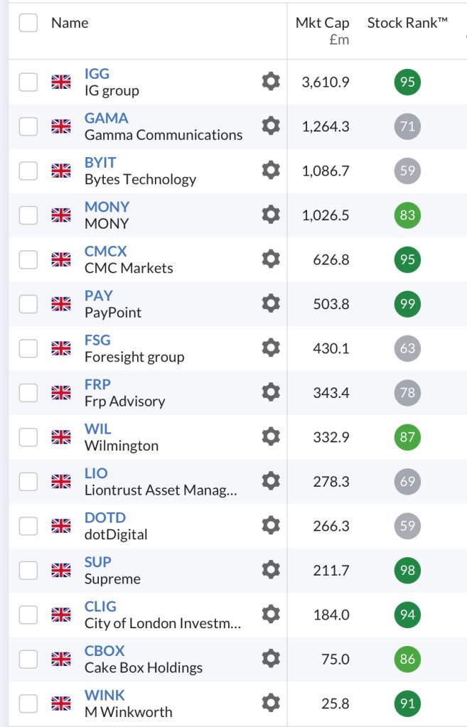 There are currently 15 UK listed companies that qualify for this screen of which I own 5 – IG Group (IGG), Gamma Communications (GAMA), Mony Group (MONY), PayPoint (PAY), Wilmington (WIL):