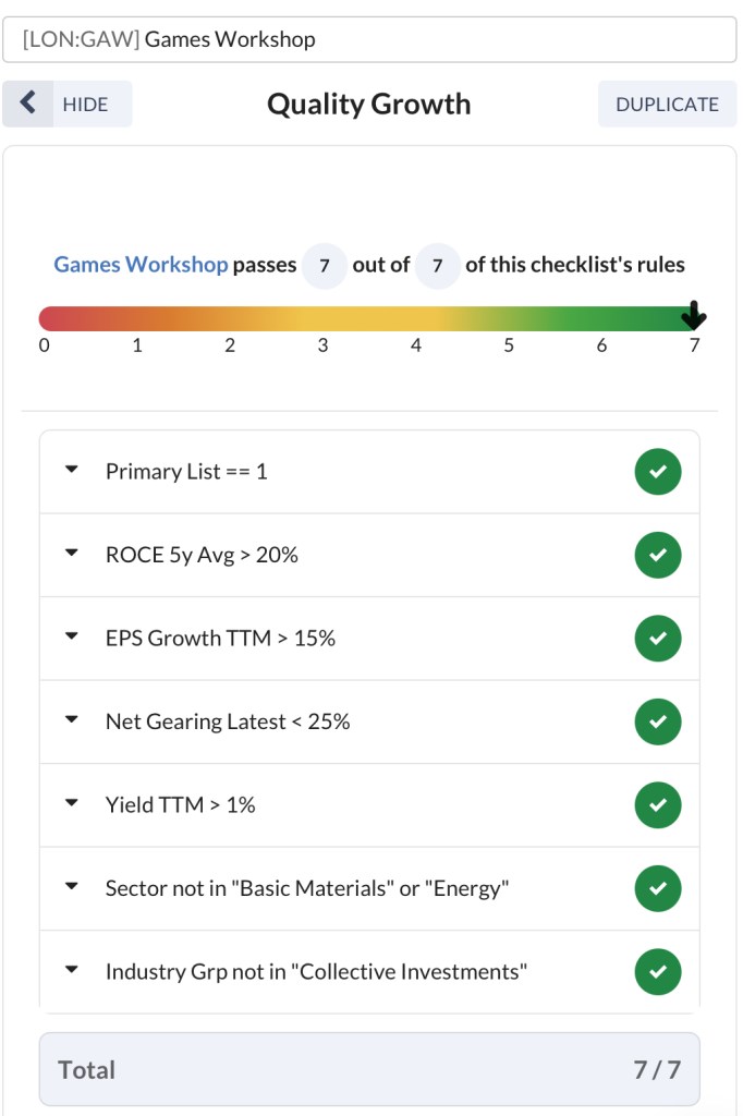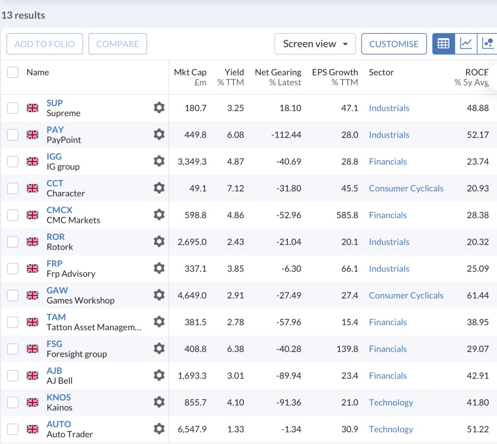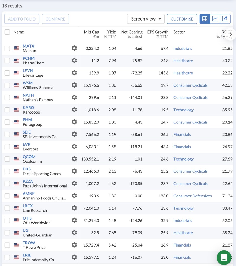 This month it is the turn of my Quality Growth screen. There are currently 13 UK companies that pass this screen, 3 of which I own; PayPoint (PAY), IG Group (IGG) and Games Workshop (GAW). And there are currently 18 US companies that pass this screen.