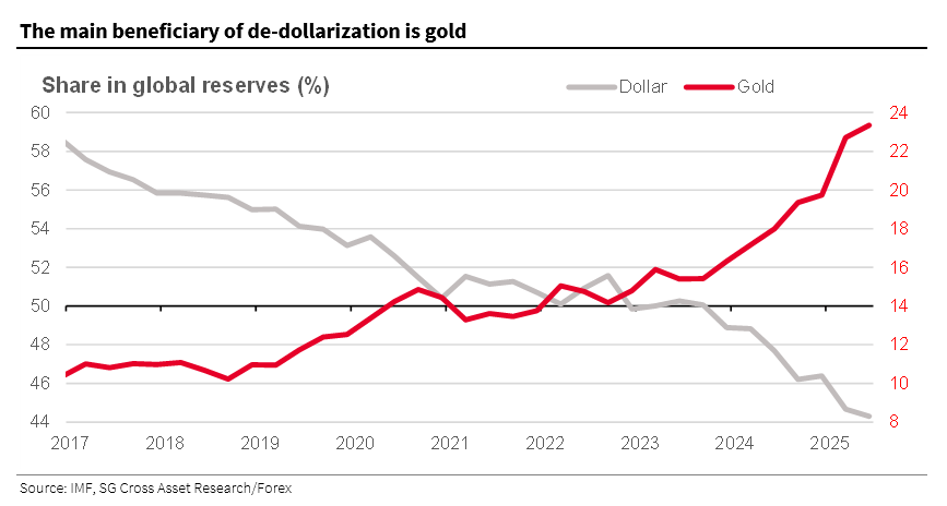 The biggest buyers of gold have been central banks and it seems to be part of a de-dollarization process. When Russia invaded Ukraine and the US confiscated Russia’s dollars, gold began to overtake the US Dollar as a share of global reserves. The gap has been widening ever since and it has accelerated quite dramatically during 2025 as the chart below shows.
