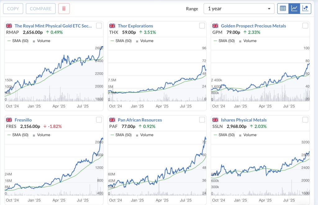 Fast forward seven months and a further 20% has been added to the gold price, gold miners have been on a tear and silver is starting to catch up. Spoiler alert, I have been buying more of all three. A glance at the 1 year chart for the metals and miners that I own tells the story of the price action.